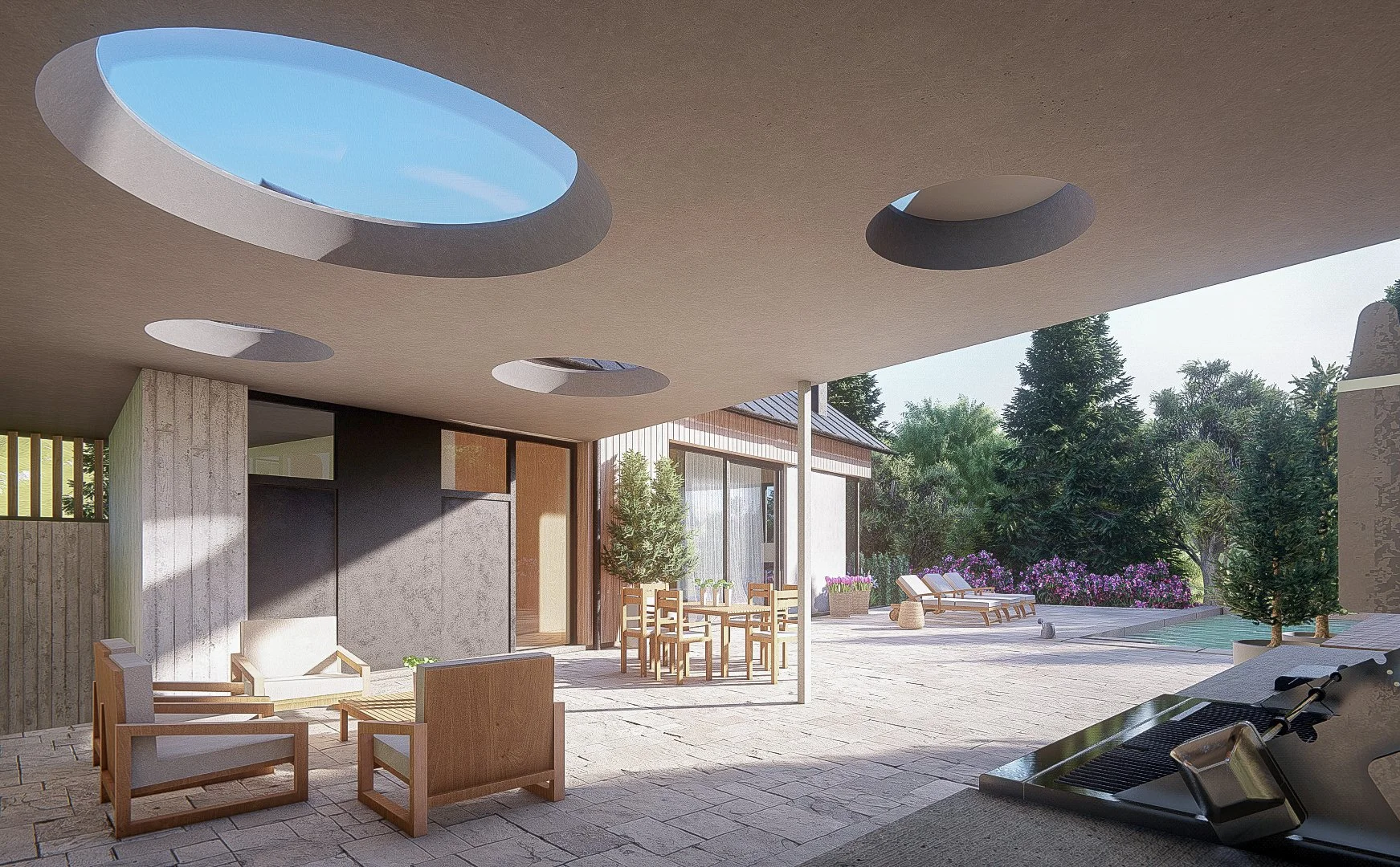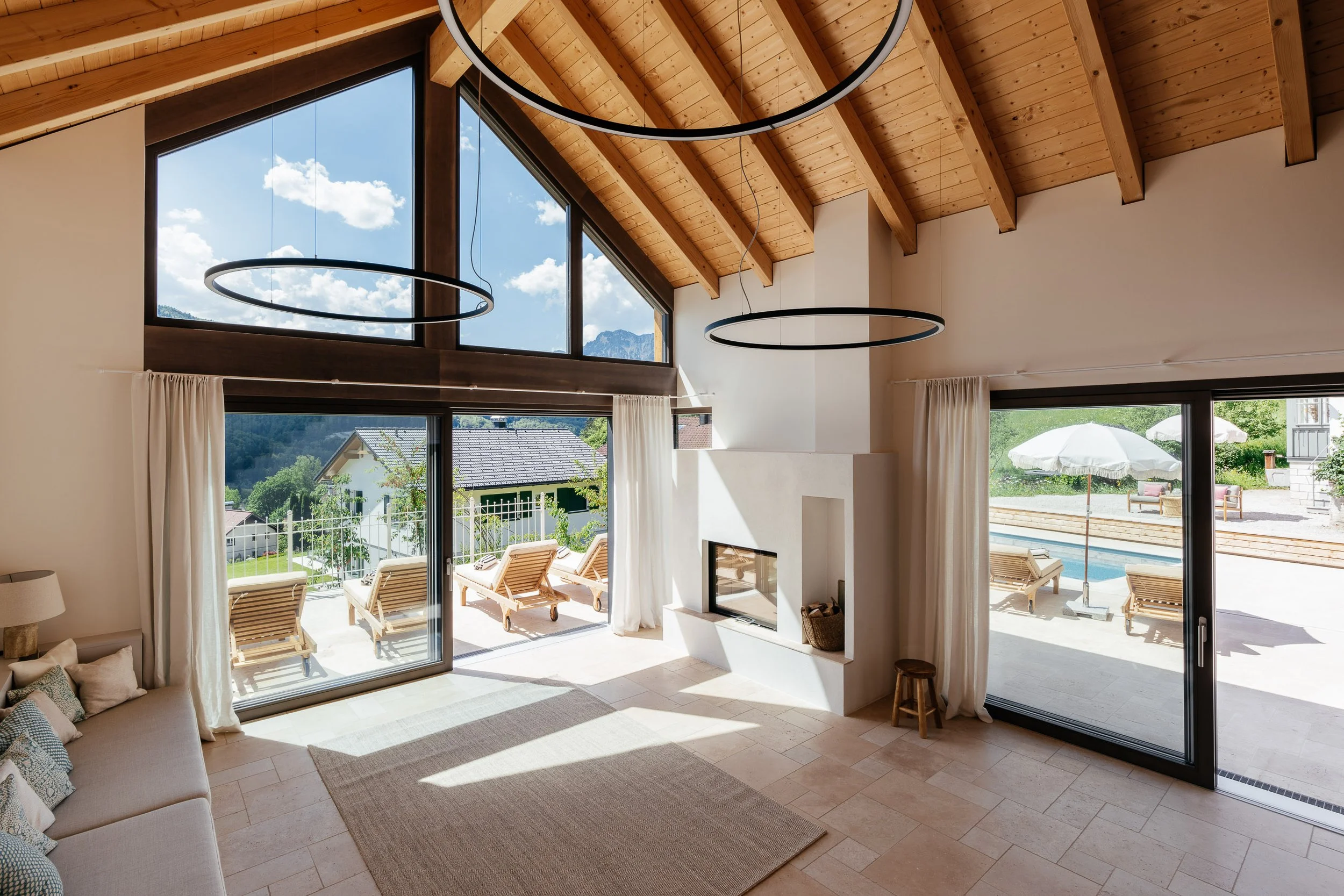 The villa offers spacious, light-filled rooms, shared living spaces, a terrace, garden, outdoor kitchen, heated pool, and sauna, with direct access to hiking trails, all creating a peaceful setting surrounded by alpine nature.