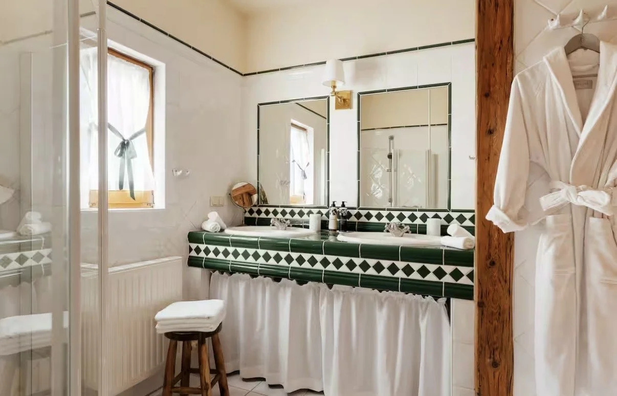 larger double rooms (shared with one other woman) with shared bathroom and fireplace — spacious and peaceful, with a shared living area.