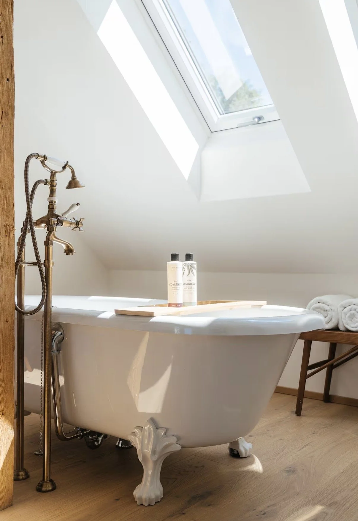 spacious double room (shared with one other woman) with king-size bed, private bathroom, free-standing bathtub, and access to a shared veranda — offering extra comfort and privacy.